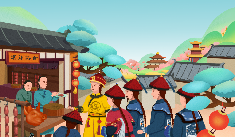 康熙二十一年春,皇帝二次東巡,途徑燕郊,飄起絲雨,恰逢午時村中造炊,炊煙裊然,煙雨相融,空濛如仙境,皇帝駐足眺望,嘆道:“煙雨空濛萬家炊,郊野有家京不回!好一派祥和煙郊!”遂下令在此建筑行宮?!盁熃肌敝畡e稱隨之流傳?;实酆笪⒎皆L至煙郊民間,食一熏雞甚妙,問詢店家才知乃使“糖熏”工藝。即打趣道:“煙